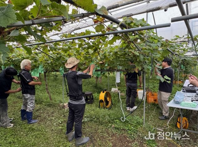 정안뉴스 황도연 기자 | 청양군농업기술센터(소장 남윤우)는 지난 30일 남양면 충절로 일원 포도 재배 농가(노승일 외)에서 농업인 어깨 부담 작업의 정확한 진단을 위해 산업용 웨어러블 로봇(편의장비)을 활용한 생체·역학적 현장평가를 실시했다고 밝혔다.