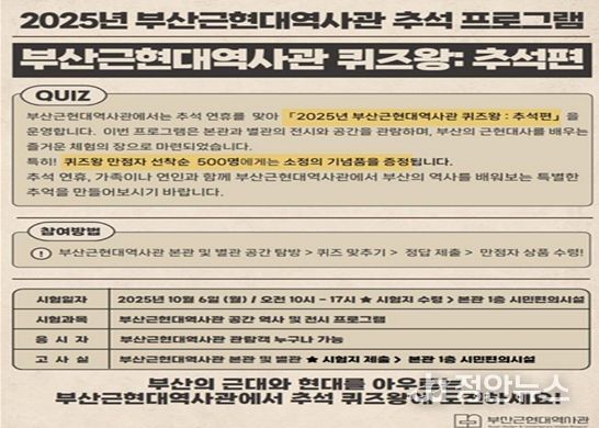 부산근현대역사관은 추석 연휴를 맞아 오는 10월 6일 오전 10시부터 오후 5시까지 시민참여 프로그램 '2025년 부산근현대역사관 퀴즈왕: 추석날편'을 운영한다고 밝혔다.