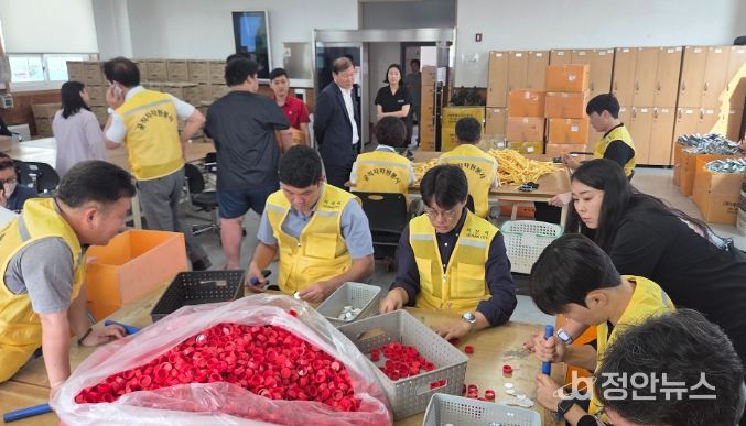 자원봉사에 참여한 직원들은 익숙하지 않은 작업이었지만 장애인생산품 조립과 포장을 도우며 구슬땀을 흘렸다.