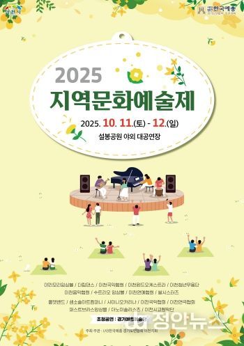 정안뉴스 안정주 기자 | (사)한국예총 이천지회가 주최·주관하는 지역 예술인들의 축제인 ‘2025년 지역문화예술제’가 오는 10월 11일부터 12일까지 이틀간 오후 2시부터 오후 6시 30분까지 설봉공원 야외대공연장에서 개최된다.