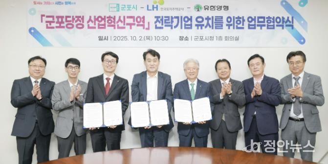 정안뉴스 안정주 기자 | 군포시는 2일 군포시청에서 한국토지주택공사(LH), ㈜유한양행과 ‘군포당정 산업혁신구역’ R·D 전략기업 유치를 위한 업무협약을 체결했다고 밝혔다.