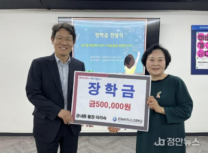 정안뉴스 안정주 기자 | 라의숙 군포시 궁내동통장협의회장은 10월 1일 군포e비즈니스고등학교에 장학금을 전달하며 지역 청소년들의 꿈을 응원하는 뜻깊은 나눔을 실천했다.