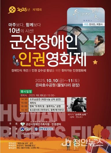정안뉴스 안정주 기자 | 군산시 장애인가족지원인권센터가 10월 10일부터 11일까지 은파호수공원 물빛다리 광장에서 군산시민을 대상으로 장애인 인식개선 및 인권의식 함양을 위한 2025년 제10회 군산장애인인권영화제를 개최한다.