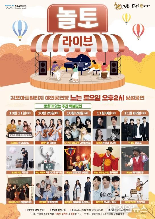 정안뉴스 안정주 기자 | (재)김포문화재단은 10월 11일부터 11월 22일까지 매월 둘째, 넷째 주 토요일마다 김포아트빌리지 야외공연장에서 하반기 토요상설공연 '놀토 라이브'를 개최한다고 밝혔다.
