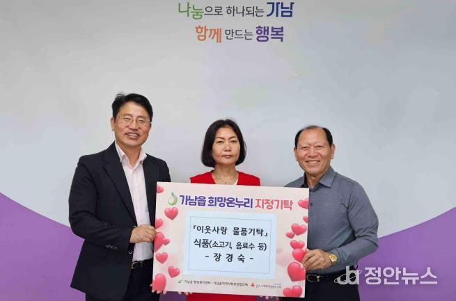 정안뉴스 안정주 기자 | 지난 9월 30일 장경숙(가남읍 주민)씨가 가남읍 내 어려운 이웃들을 위해 소고기와 음료수 등 식품을 가남읍 행정복지센터에 기탁했다.