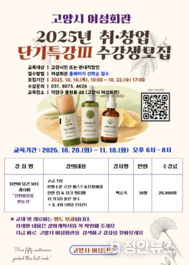정안뉴스 안정주 기자 | 고양특례시 여성회관에서는 친환경과 건강을 중시하는 최신 트렌드를 반영한‘취창업 단기특강Ⅲ’수강생을 모집한다.