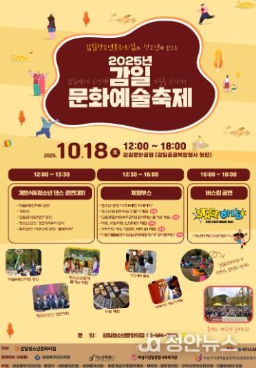정안뉴스 안정주 기자 | 하남시 감일청소년문화의집은 오는 10월 18일 오후 12시부터 18시까지 감일문화공원(감일공공복합청사 뒷편)에서 '제2회 감일문화예술축제'를 개최한다.
