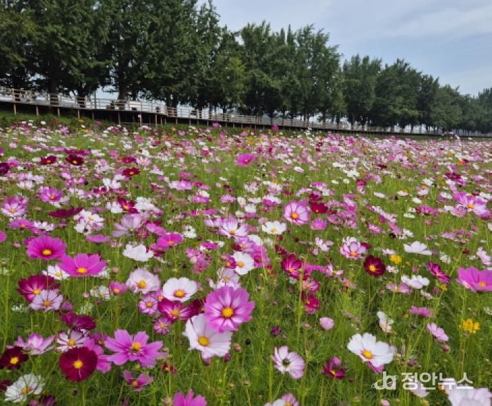 정안뉴스 황도연 기자 | 아산시가 곡교천 방문객에게 휴식공간과 볼거리를 제공하기 위해 조성한 ‘곡교천 가을 초화원’이 가을꽃으로 아름답게 물들었다고 밝혔다.