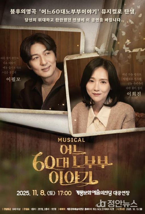 정안뉴스 황도연 기자 | 계룡시는 오는 11월 8일 오후 5시, 계룡문화예술의전당 대공연장에서 뮤지컬 ‘어느 60대 노부부 이야기’를 공연한다.