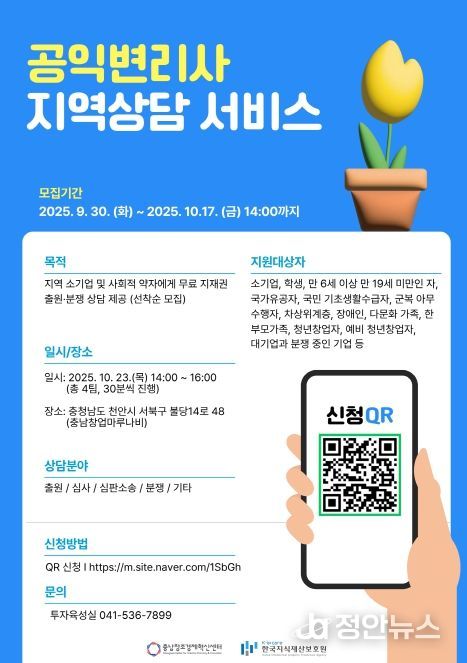 정안뉴스 황도연 기자 | (재)충남창조경제혁신센터는 오는 10월 23일 오후 2시~4시, 충남 천안시 불당동 소재 창업지원공간 충남창업마루나비에서 공익변리사 무료 상담 서비스를 운영한다고 밝혔다.