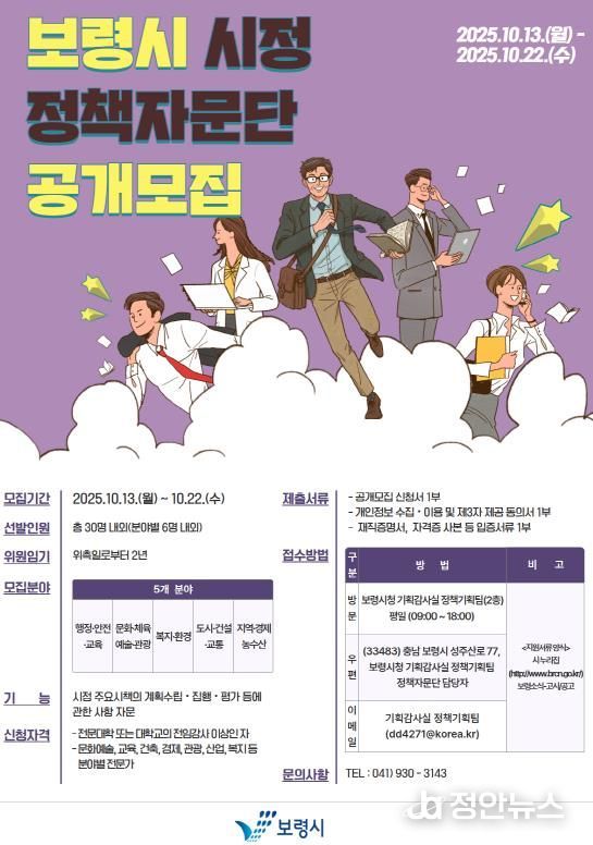 정안뉴스 황도연 기자 | 보령시는 지역 시정 발전에 대해 조언·권고·건의 등의 자문을 얻고자 보령시 시정 정책자문단 신규 위원을 10월 13일부터 22일까지 10일간 공개 모집한다고 밝혔다.