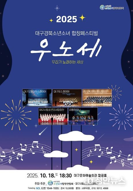 정안뉴스 안정주 기자 | 대구경북소년소녀합창연합회 제1회 연합합창제 ‘우리가 노래하는 세상(우노세)’가 10월 18일 저녁 6시 30분, 대구문화예술회관 팔공홀에서 펼쳐진다.