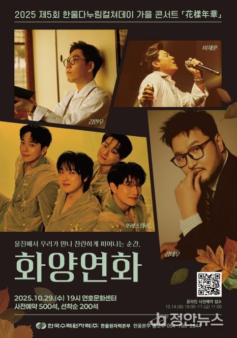 정안뉴스 안정주 기자 | 한국수력원자력(주) 한울원자력본부는 오는 10월 29일 19시 울진군 연호문화센터에서 ‘화양연화(花樣年華): 찬란하게 빛났던 그 순간’을 주제로, 긴 세월에도 잊히지 않는 청춘의 명곡들을 되새기며 깊어져 가는 늦가을의 정취를 나누고자 제5회 한울다누림컬쳐데이 가을 콘서트를 개최한다.