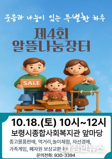 정안뉴스 황도연 기자 | 보령시종합사회복지관은 오는 10월 18일 오전 10시부터 12시까지 복지관 앞마당에서 ‘제4회 알뜰나눔장터’를 개최한다.