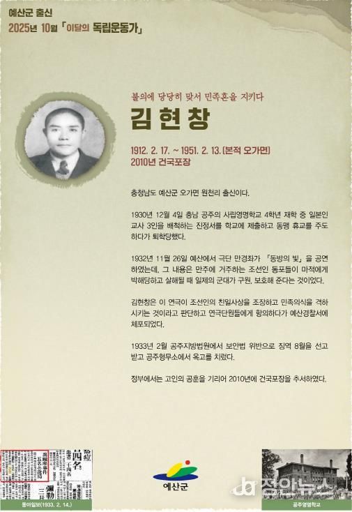 정안뉴스 황도연 기자 | 예산군은 오가면 원천리 출신 김현창 선생을 ‘2025년 10월 이달의 독립운동가’로 선정했다고 밝혔다.