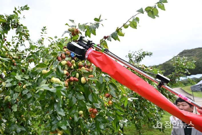 정안뉴스 황은경 기자 | 충북농업기술원은 보은대추축제를 앞둔 10월 15일, 대추연구소에서 농업인과 관계자를 대상으로 ‘대추 신품종 평가회’와 ‘휴대용 수확기 연시회’를 개최했다고 밝혔다.
