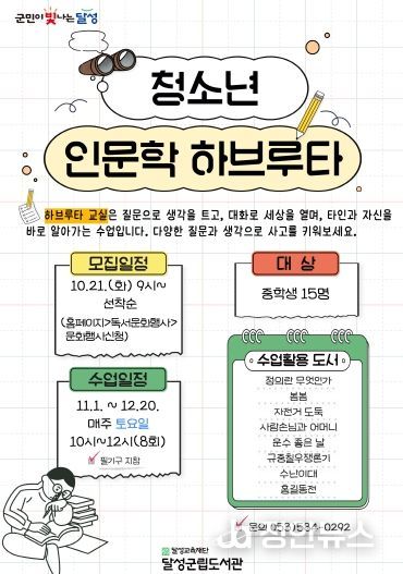 참여 대상은 중학생이며, 신청은 10월 21일 오전 9시부터 달성군립도서관 홈페이지를 통해 선착순으로 진행된다.