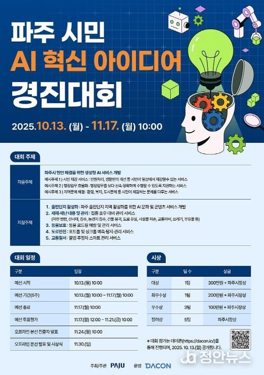 정안뉴스 안정주 기자 | 파주시는 10월 13일부터 11월 17일까지 시민이 직접 참여하는 ‘파주 시민 인공지능(AI) 혁신 아이디어 경진대회’를 개최한다고 밝혔다.
