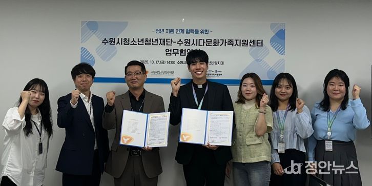정안뉴스 안정주 기자 | 수원시청년지원센터는 지난 10월 17일 수원시다문화가족지원센터와 상호 교류 및 연계협력을 위한 업무협약을 체결했다.