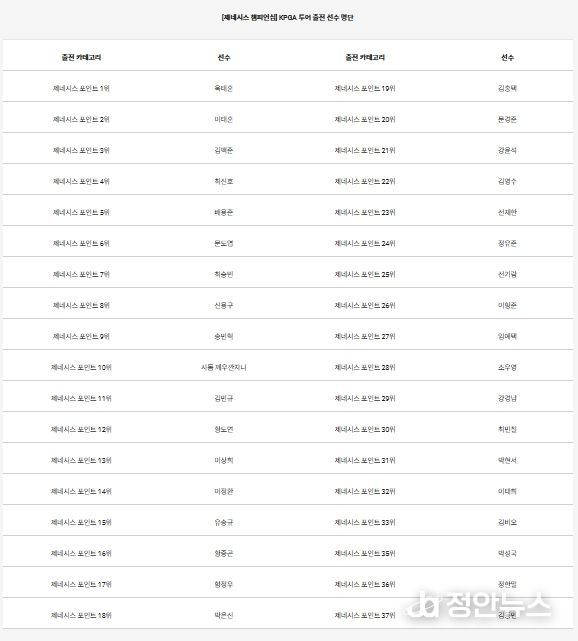 ‘더채리티클래식 2025’ 전까지 제네시스 포인트 42위에 위치했던 정한밀(34.경희)은 ‘더채리티클래식 2025’에서 공동 21위에 올라 제네시스 포인트 순위가 6계단 상승해 제네시스 포인트 36위로 대회 출전 자격을 획득했다.