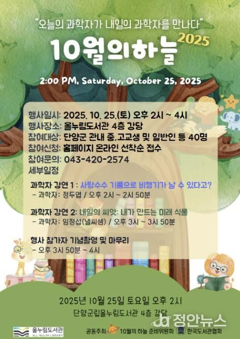 정안뉴스 황은경 기자 | 충북 단양군립올누림도서관은 오는 25일 오후 2시부터 4시까지 과학자들의 재능기부로 진행되는 ‘10월의 하늘’ 과학 행사를 운영한다고 밝혔다.