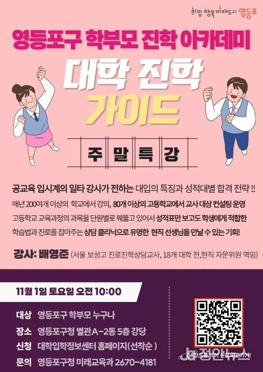 정안뉴스 안정주 기자 | 영등포구가 변화하는 입시 제도에 맞춤형 정보를 제공하는 ‘학부모 진학아카데미’를 확대 운영한다고 밝혔다.