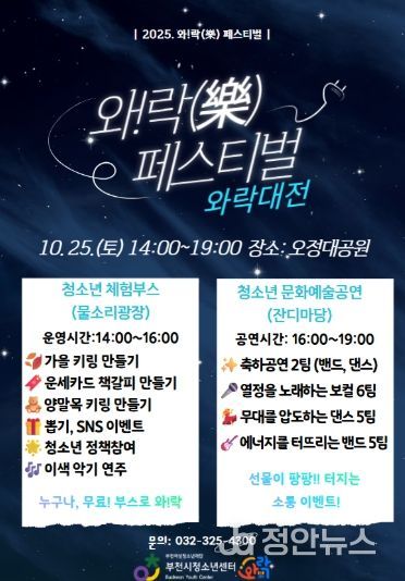 정안뉴스 안정주 기자 | 부천여성청소년재단이 운영하는 부천시청소년센터는 오는 10월 25일 오후 2시, 부천 오정대공원에서 와!락(樂) 페스티벌 ‘와락대전’을 진행한다고 밝혔다.