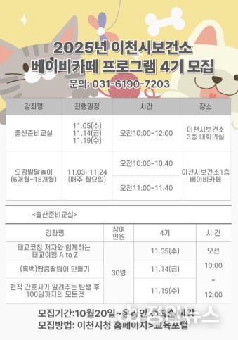정안뉴스 안정주 기자 | 이천시는 임산부 및 6개월~15개월 영아의 보호자를 대상으로 10월 20일부터 ‘베이비카페 프로그램 4기’ 대상자를 선착순으로 모집 중이다. 온라인 신청(이천시청 누리집-교육포털-교육 강좌 신청)을 통해 선착순으로 접수하며 오감 발달 놀이의 경우 각 12명씩을 모집한다.