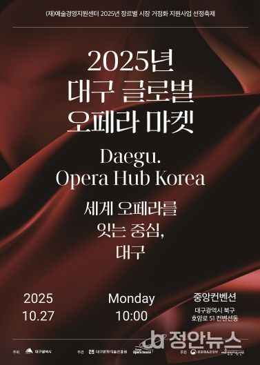 정안뉴스 안정주 기자 | (재)대구문화예술진흥원 대구오페라하우스는 문화체육관광부와 예술경영지원센터가 추진하는‘2025 장르별 시장 거점화 지원사업’에 선정돼, 오는 10월 27일 중앙컨벤션홀(대구 북구 호암로 51)에서 ‘2025 대구 글로벌 오페라 마켓’을 개최한다.