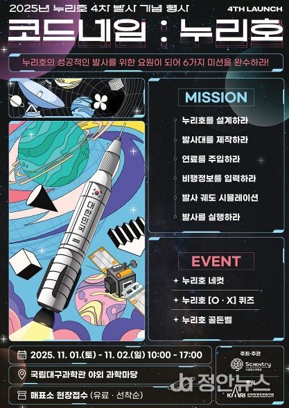정안뉴스 안정주 기자 | 국립대구과학관은 오는 2025년 11월 27일로 예정된 누리호 4차 발사를 기념해, 우주개발에 대한 국민적 관심을 높이고 과학문화 확산을 도모하기 위한 기념 행사를 개최한다.