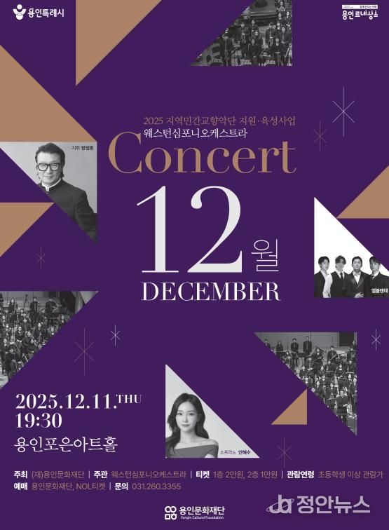 정안뉴스 안정주 기자 | 용인문화재단은 오는 12월 11일 오후 7시 30분, 용인포은아트홀에서 웨스턴심포니오케스트라 '콘서트 ‘12월’' 공연을 개최한다.