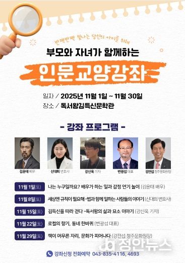 정안뉴스 황은경 기자 | 충북 증평군이 내달부터 독서왕김득신문학관 2층 문예배움실에서 ‘부모와 자녀가 함께하는 인문교양강좌’를 연다.