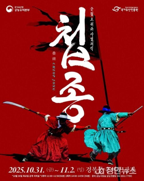 정안뉴스 안정주 기자 | 국가유산청 궁능유적본부는 국가유산진흥원과 함께 10월 31일부터 11월 2일까지 하루 2회(오전 11시, 오후 2시) 경복궁(서울 종로구) 흥례문 광장에서 '2025년 궁궐 호위군 사열의식 ‘첩종(疊鐘)’' 행사를 개최한다.