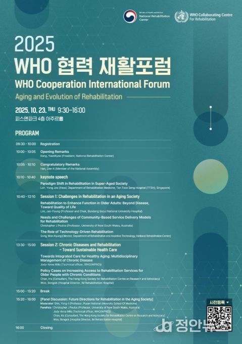 정안뉴스 안정주 기자 | 보건복지부 국립재활원은 10월 23일 피스앤파크 컨벤션(서울 용산구)에서 ‘세계보건기구(WHO) 협력 재활 토론회’를 대면 및 온라인으로 동시 개최한다.