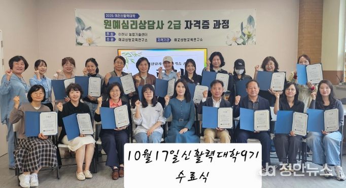 정안뉴스 안정주 기자 | 이천시 농업기술센터가 주최하고 예교상담교육연구소가 주관한 ‘이천신활력대학 제9기 원예심리상담사 2급 자격증 과정’이 지난 10월 17일, 이천신활력대학 교육장에서 수료식을 열고 8주간의 교육 일정을 성공적으로 마무리했다.