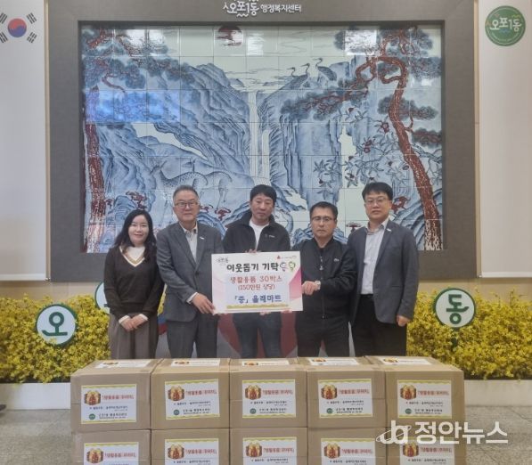 정안뉴스 안정주 기자 | 광주시 오포1동에 위치한 올래마트에브리데이 김광인 대표는 23일 오포1동 행정복지센터를 방문, 어려운 이웃들에게 전달해 달라며 세탁세제와 주방세제 등 생필품 선물꾸러미 30박스(150만 원 상당)를 기탁했다.