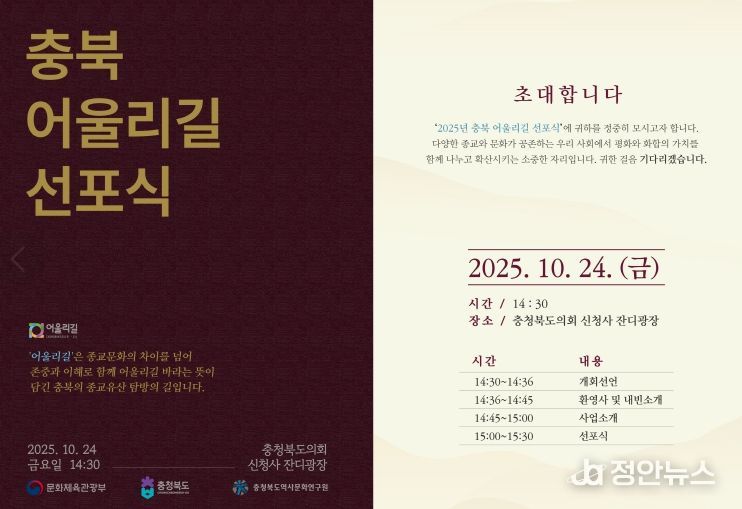 김영환 지사는 “오늘 선포식은 종교의 울타리를 넘어 새로운 화합의 길을 여는 뜻깊은 자리”라며, “어울리길이 앞으로도 도민의 일상 속에 자연스럽게 스며들고, 충북이 대한민국 종교 평화의 중심지로 우뚝 설 수 있도록 노력을 이어가겠다”고 밝혔다.