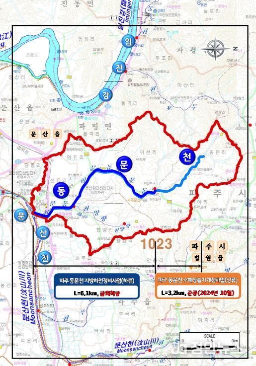 정비사업은 파주시 문산읍 선유리에서 법원읍 동문리에 이르는 동문천 일원 총 연장 6.1km 구간의 하천을 정비하는 것으로 ▲축제공(제방 쌓기) 6.1km ▲보축(제방 보수·보강)2.4km ▲교량 5개소 설치 등이 포함된다.