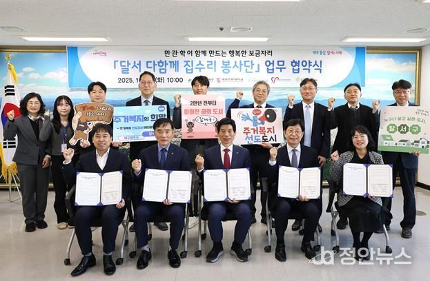 정안뉴스 안정주 기자 | 대구 달서구는 28일 구청에서 5개 기관이 참여한 가운데 ‘달서 다함께 집수리 봉사단’ 업무협약식을 열고, 기술 봉사와 복지 서비스를 결합한 새로운 상생형 주거복지 모델의 출발을 알렸다.