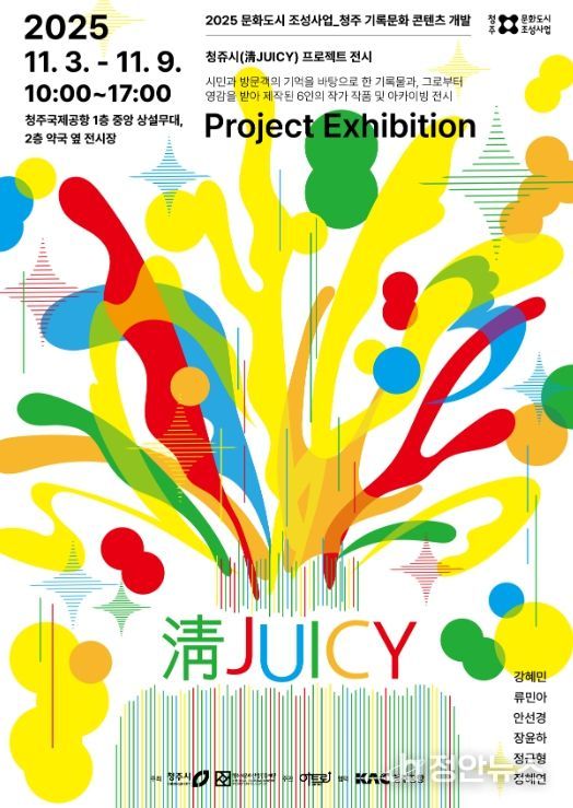 정안뉴스 황은경 기자 | 청주시와 청주시문화산업진흥재단은 오는 11월 3일부터 9일까지 청주국제공항에서 지역 예술인 작품 전시회인 ‘청쥬시(淸JUICY) 프로젝트’를 진행한다고 전했다.