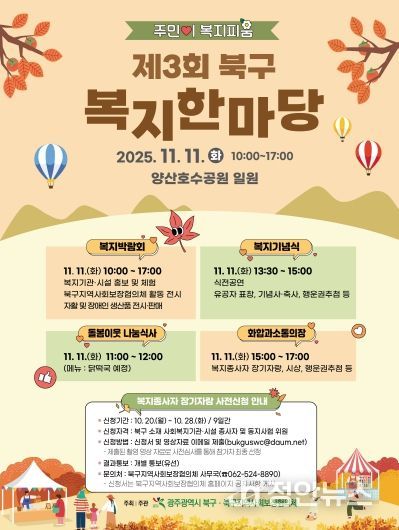 정안뉴스 안정주 기자 | 광주광역시 북구는 오는 11일 양산호수공원 일대에서 ‘복지한마당’ 행사를 개최한다고 10일 밝혔다.