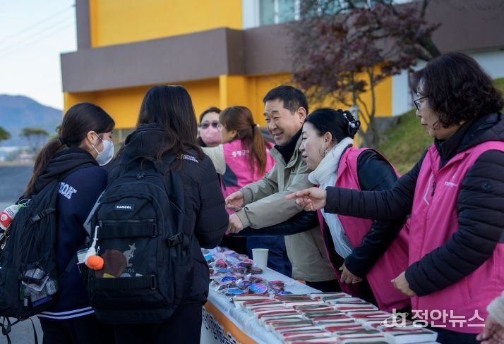 정안뉴스 황은경 기자 | 증평군여성단체협의회는 11일 형석고등학교 일원에서 ‘2025학년도 수능 수험생 응원 사랑빵 나눔’ 행사를 진행했다.