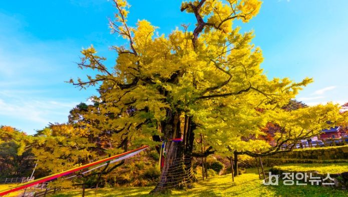 특히 은행나무의 웅장한 자태와 맑은 하늘, 주변 산자락의 붉은 단풍이 어우러져 한 폭의 풍경화를 연상케 하며, 가족 단위 나들이객과 사진동호회 회원들이 삼삼오오 방문해 깊어 가는 가을의 운치를 즐기고 있다.