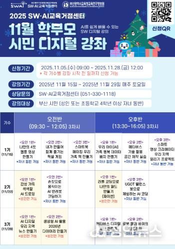 정안뉴스 황정혜 기자 | 부산광역시교육청교육연구정보원은 오는 15일부터 29일까지 매주 토요일마다 북구 덕천동 소재 SW·AI교육거점센터에서 시민 200여 명을 대상으로 ‘시민 디지털 강좌’를 운영한다.