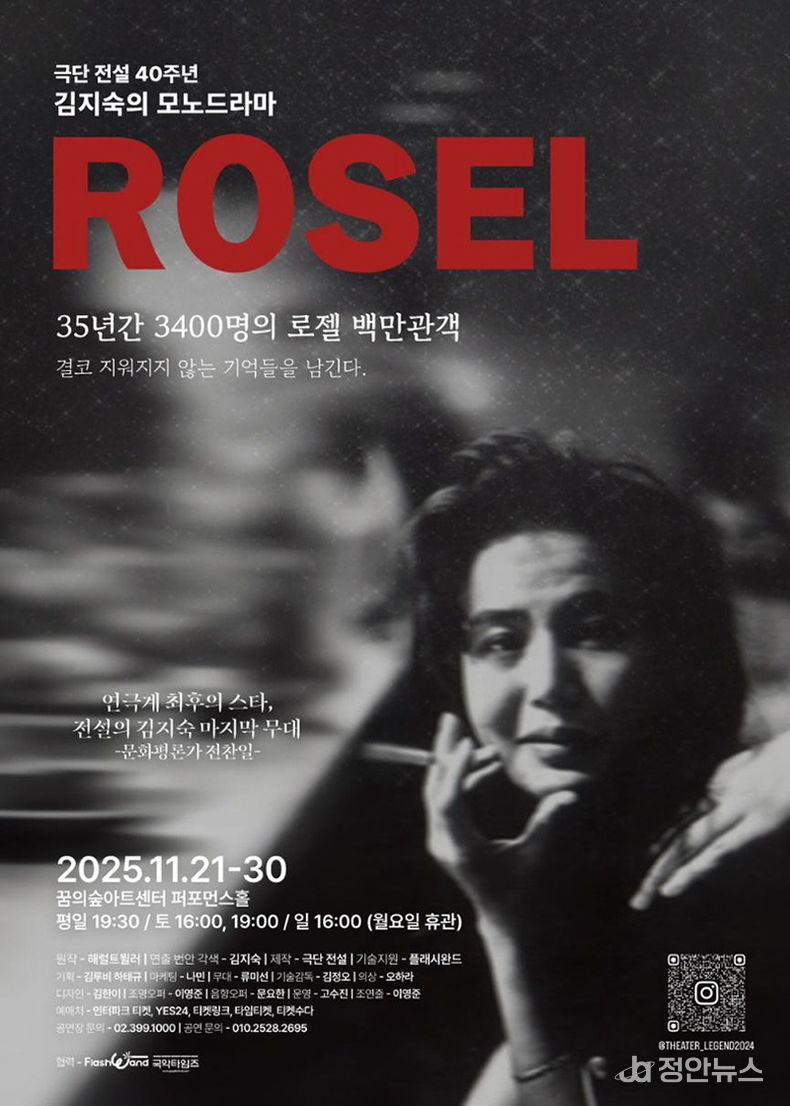 정안뉴스 안정주 기자 | 극단 전설 40주년 기념작이자 배우 김지숙의 마지막 공연인 모노드라마 〈로젤〉이 오는 11월 21일부터 30일까지 꿈의숲아트센터 퍼포먼스홀에서 막을 올린다. 35년간 3,400회 이상 공연되며 백만 명이 넘는 관객을 울린 이 작품은 여성의 주체성과 인간성의 회복을 그린 한국 연극사의 대표작으로 꼽힌다.
