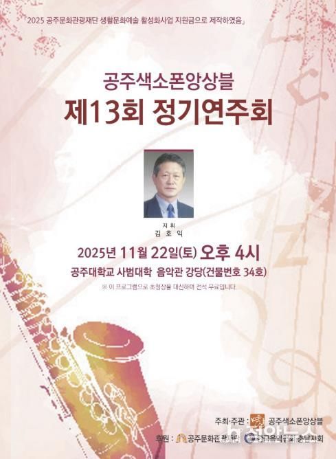 정안뉴스 황도연 기자 | 공주색소폰앙상블은 2025.11.22 오후 4시, 공주대학교 사범대학 음악관에서 제13회 정기연주회를 개최한다.