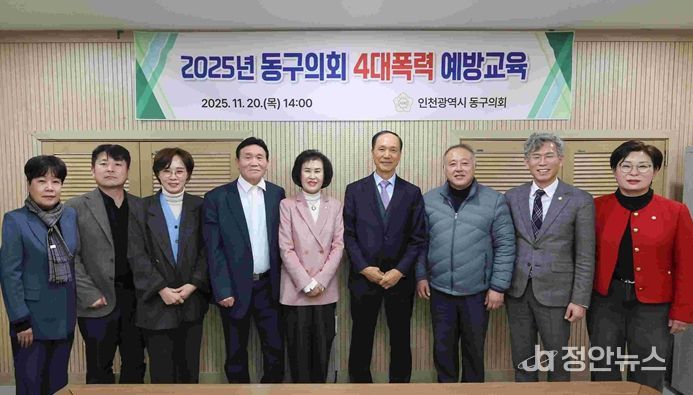 정안뉴스 안정주 기자 | 인천 동구의회는 지난 20일 의회 세미나실에서 구의원과 의회사무과 공무원을 대상으로 ‘4대 폭력 예방교육’을 실시했다.