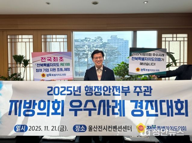 정안뉴스 안정주 기자 | 전북특별자치도의회가 지난 21일 울산전시컨벤션센터에서 열린 행정안전부 주관 ‘2025년 지방의회 우수사례 경진대회’에서 본선에 진출해 수상하는 영예를 안았다.