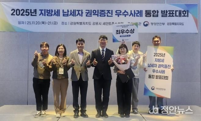 정안뉴스 황도연 기자 | 당진시는 지난 11월 20일부터 11월 21일까지 강릉시 세인트존스호텔에서 열린‘2025년 지방세 납세자 권익증진 우수사례 통합 발표대회’에서 최우수상(행정안전부장관상)을 수상했다고 25일 밝혔다.