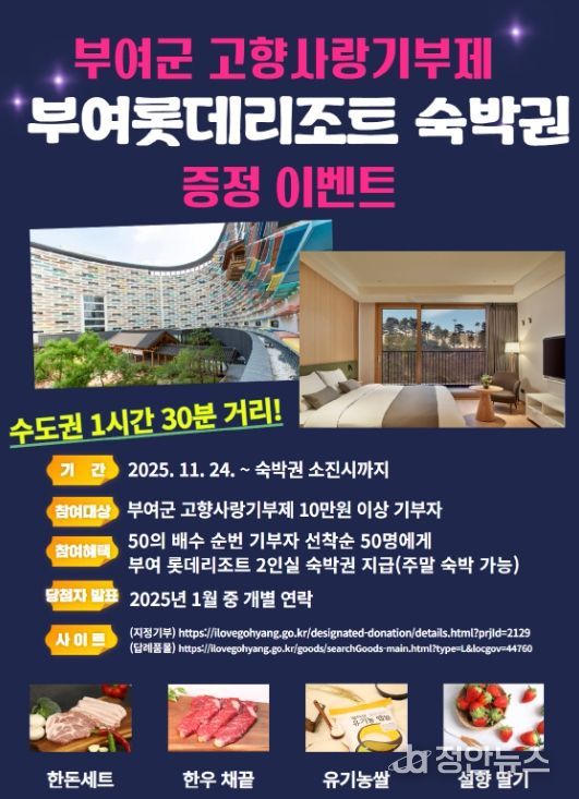 정안뉴스 황도연 기자 | 부여군은 고향사랑기부제 참여를 확대하고 지역 관광 활성화를 도모하기 위해 11월 24일부터 숙박권 소진 시까지 ‘부여롯데리조트 숙박권 증정 이벤트’를 추진한다고 밝혔다.